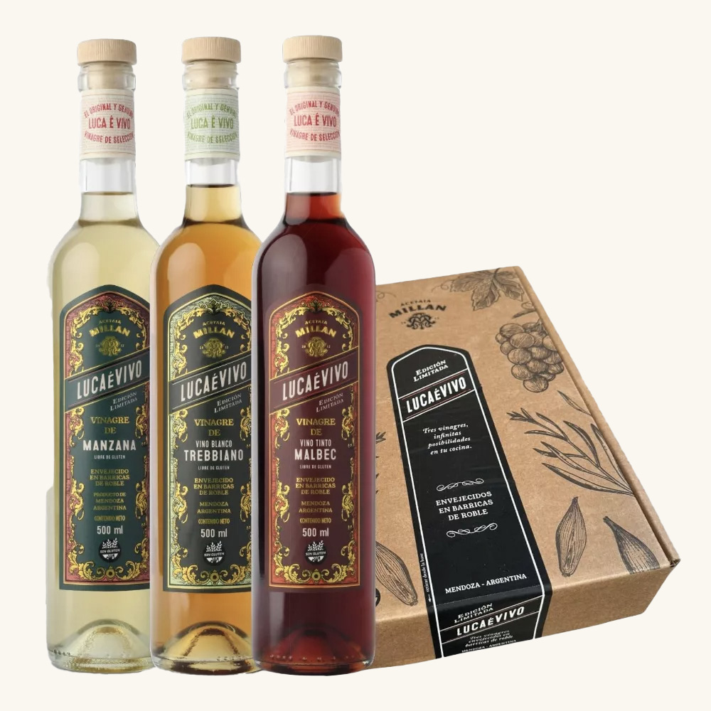 Disfruta la colección completa de vinagres premium LUCAéVIVO, añejados en roble y presentados en un elegante estuche. Un regalo ideal para amantes de la cocina.